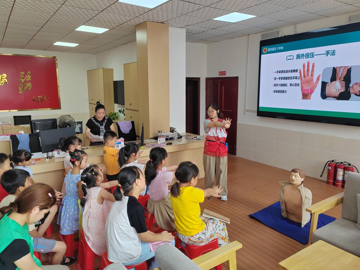 县红十字会志愿者从暑期防溺水安全教育入手,通过图片、视频、事例以及有奖互动问答等方式,用“童言童语”说安全,重点强调“预防为先、科学施救”的理念,生动讲解了如何防止溺水事故发生、溺水的自救与互救、溺水岸上急救等内容。同时,利用假人模具,模拟发生溺水后心跳、呼吸骤停的场景,详细讲解了徒手心肺复苏(CPR)的救护技术要领,现场示范了关键操作步骤。