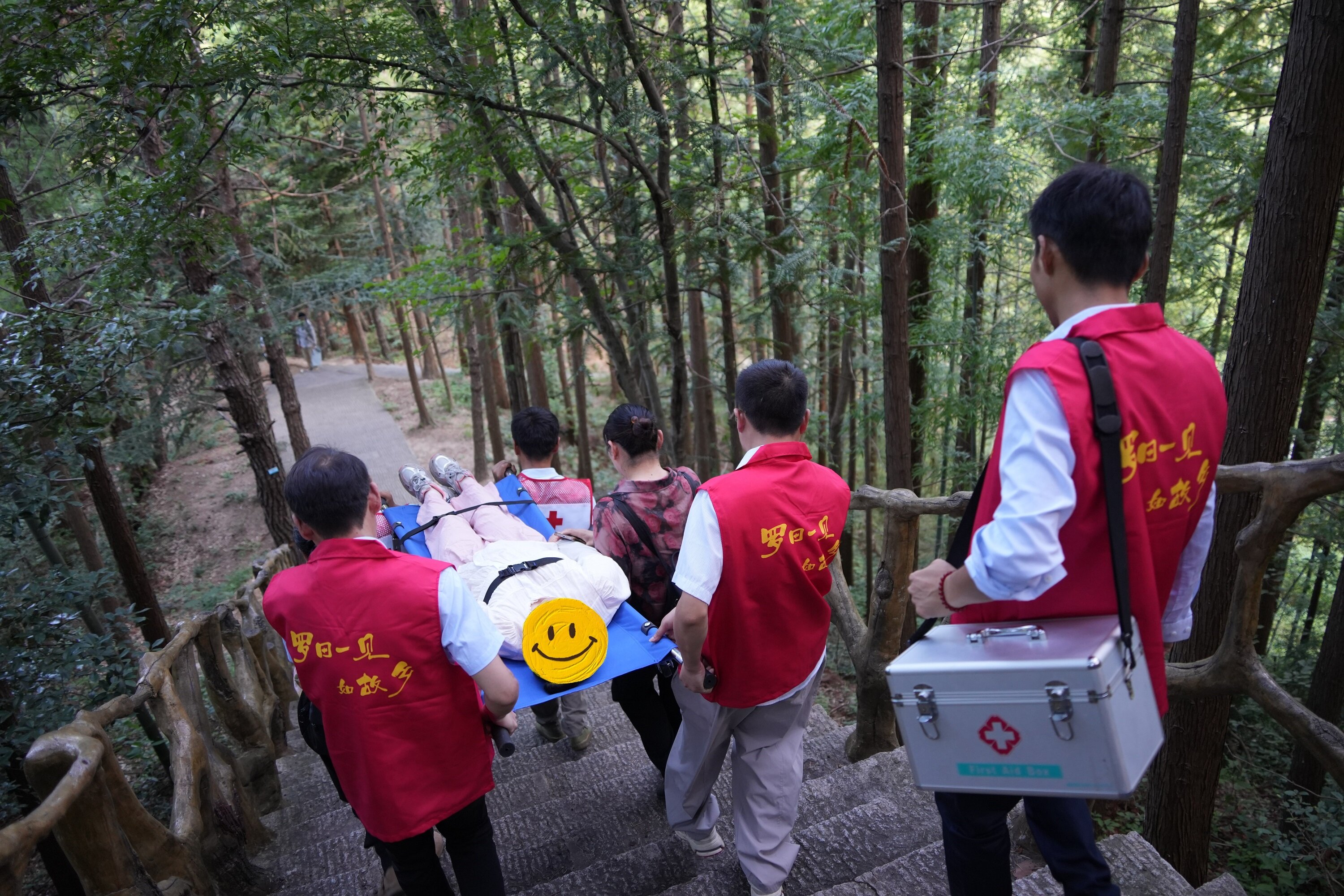 接到求助后,正在线上值守的景区红十字应急救援志愿服务队队员余水潮、黄威、张园等前往现场施救。志愿者们携带防暑药品和担架,迅速赶赴事发地点。经初步检查,游客因高温天气导致体力透支,出现中暑症状,志愿者们立即采取防暑降温措施,并用担架将游客安全转移至景区红十字救护站。经过专业处置,游客身体状态逐渐恢复,转危为安。